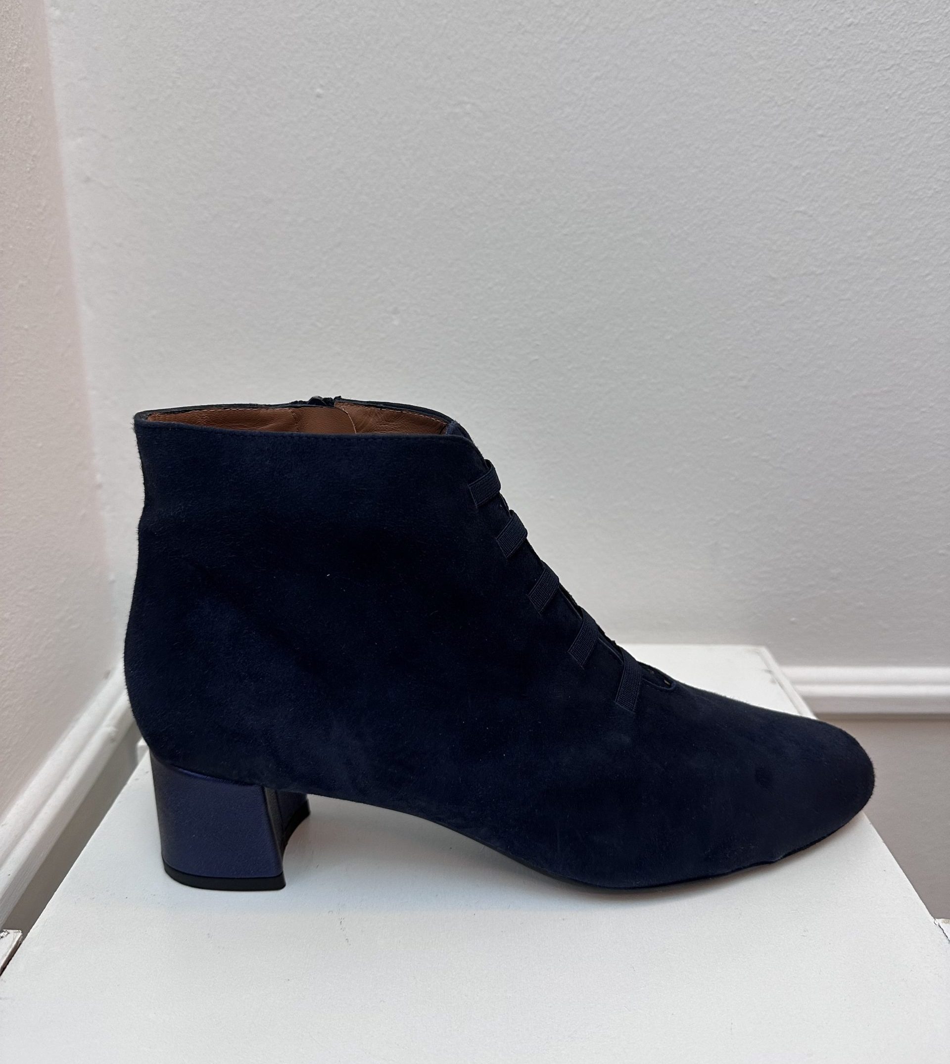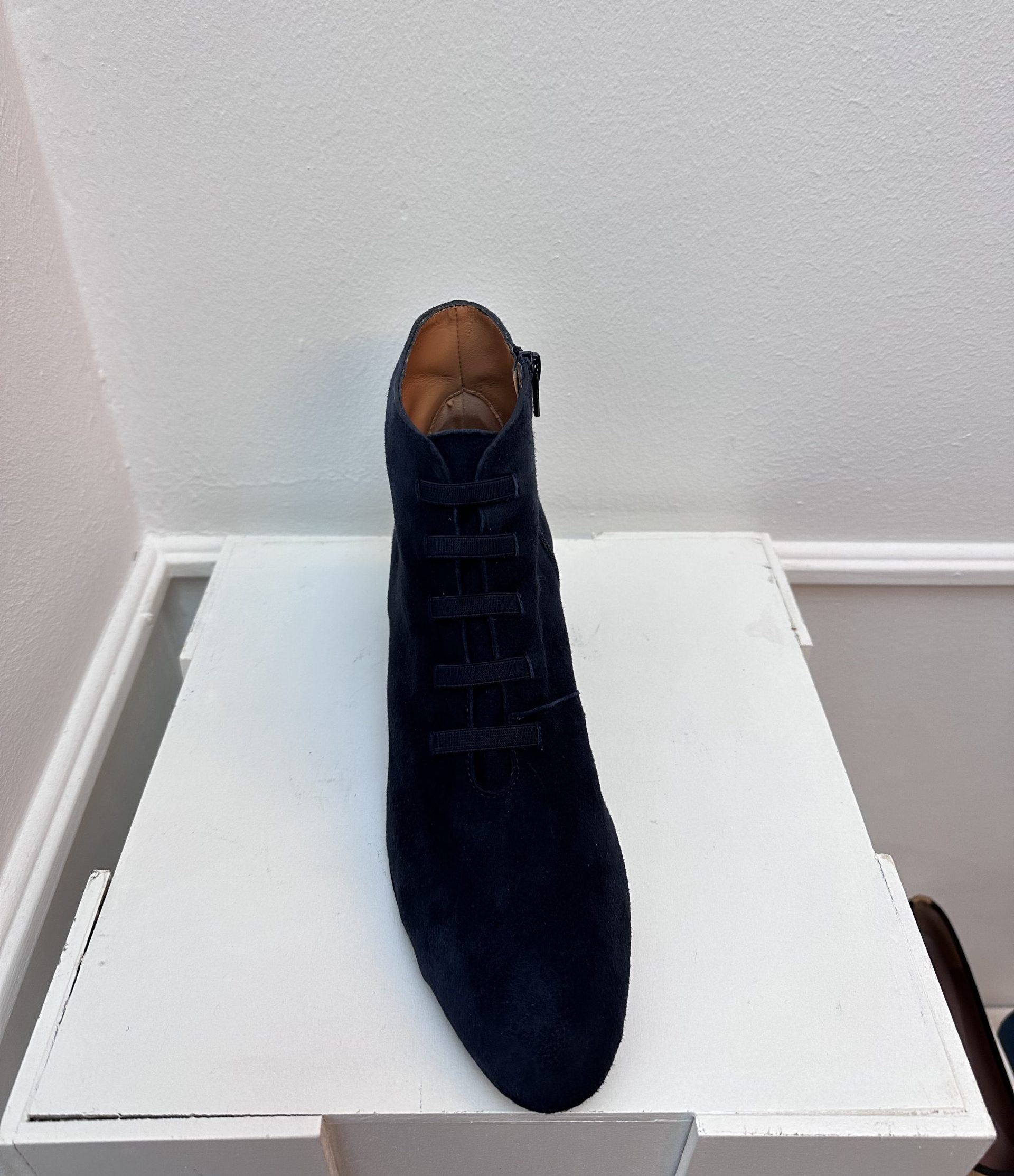 Korte laarsjes in donkerblauw suède. Hak is donkerblauw metallic glad leer.