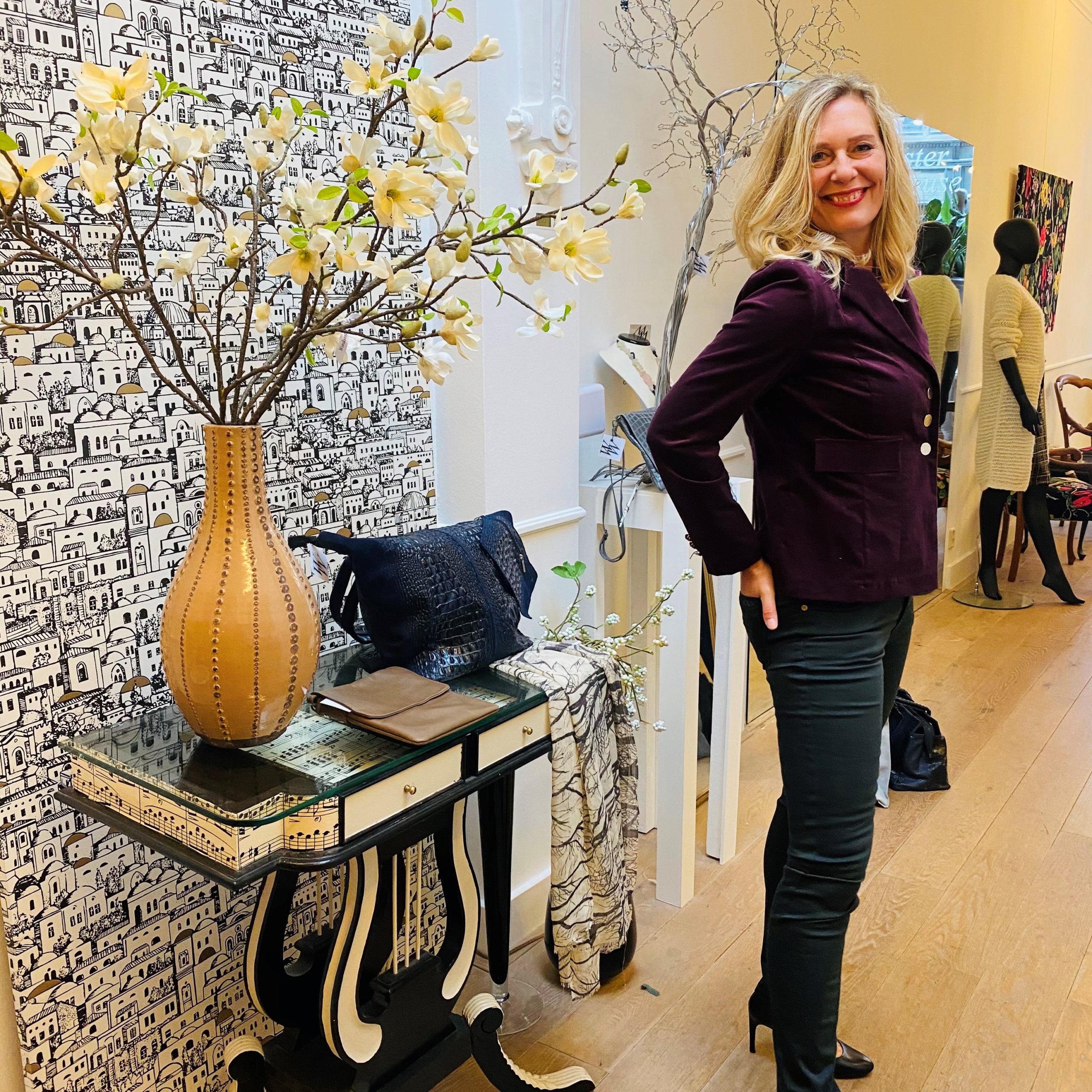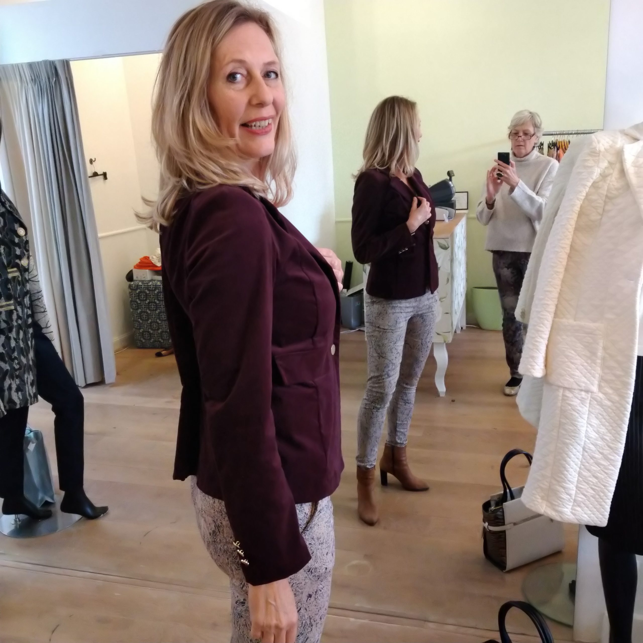 This cotton/el stretch velvet blazer is very comfortable and stylish at the same time. The beautiful deep coral color is easy to combine with a lot of other autumn colors. It is slightly tailored and is unlined and has matt gold buttons on sleeves and front. Also available in dark aubergine color .