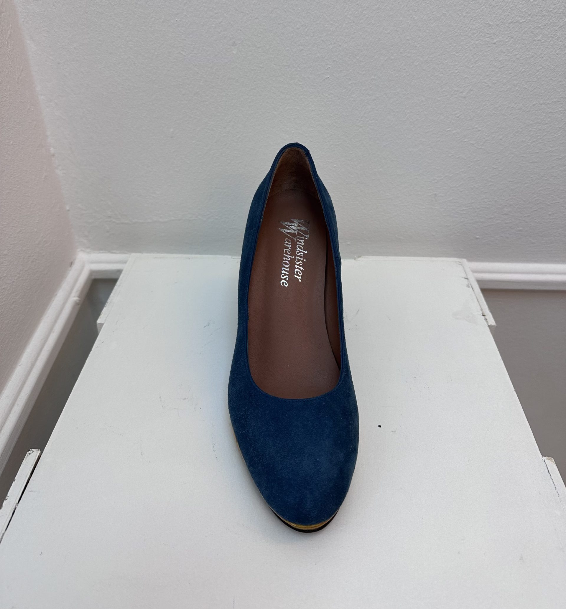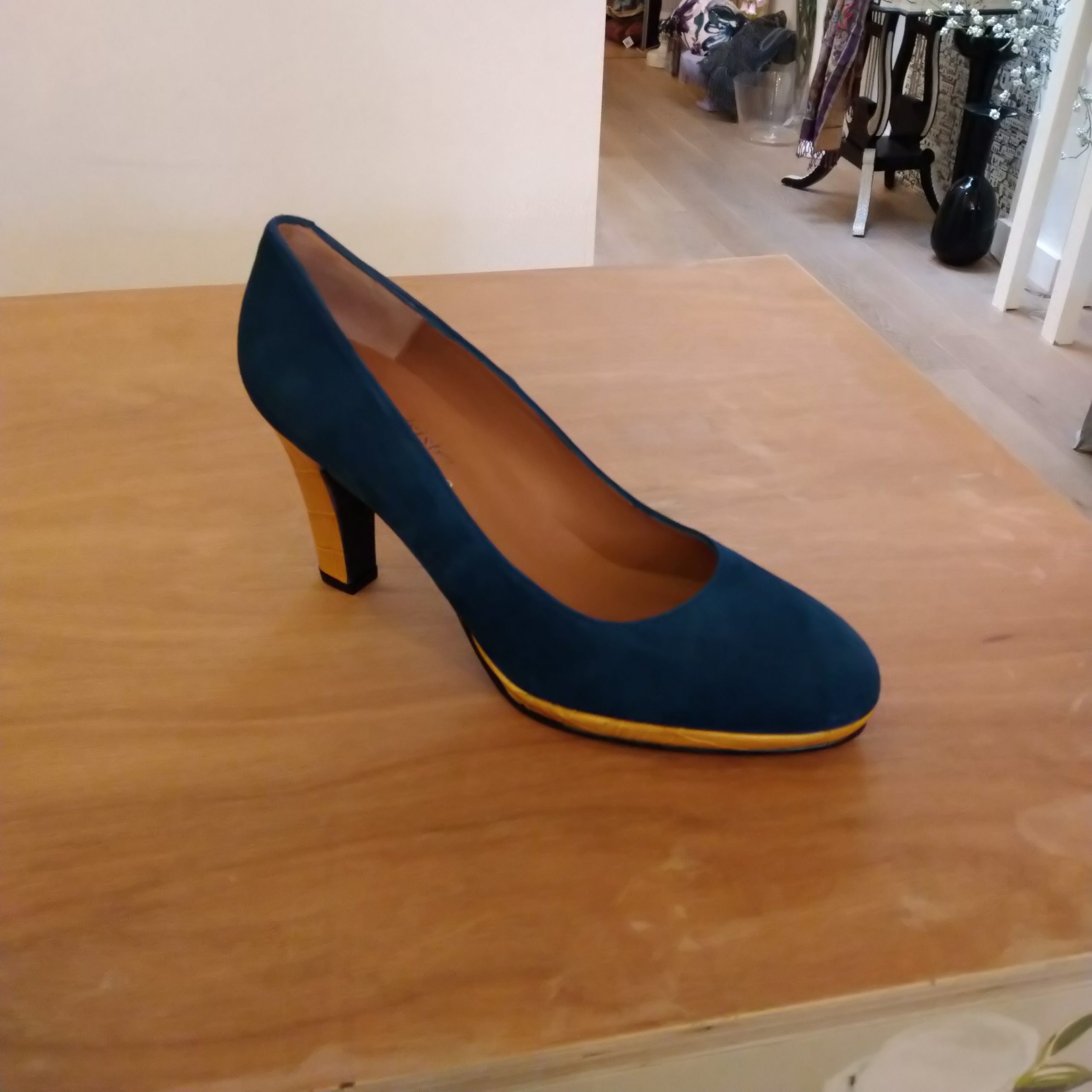 Suede pumps in petrol kleur met de hak en zool in okerkeur croco leer. Het binnenwerk ook geheel van leder, met memory foam in de binnenzool voor extra comfort.